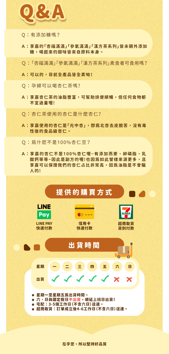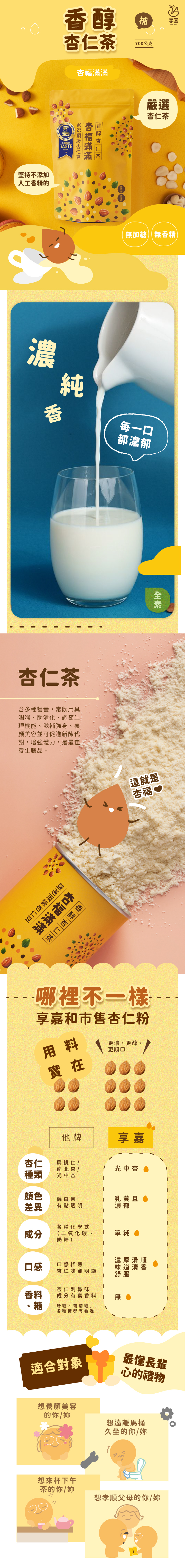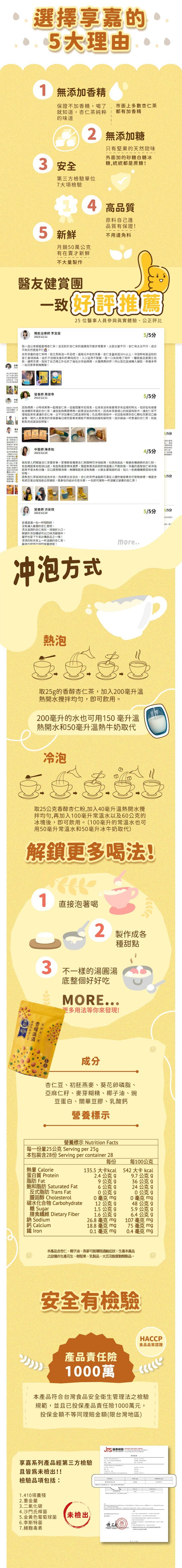 《杏仁茶》含多種營養,常飲用具潤喉、助消化、調節生理機能、滋補強身、養顏美容並可促進新陳代謝,增強體力,是最佳養生膳品。享嘉杏仁茶特選杏仁豆,製作過程衛生安全,食用方便適合早餐、宵夜點心,開水一沖即可享受的滋補茶點。